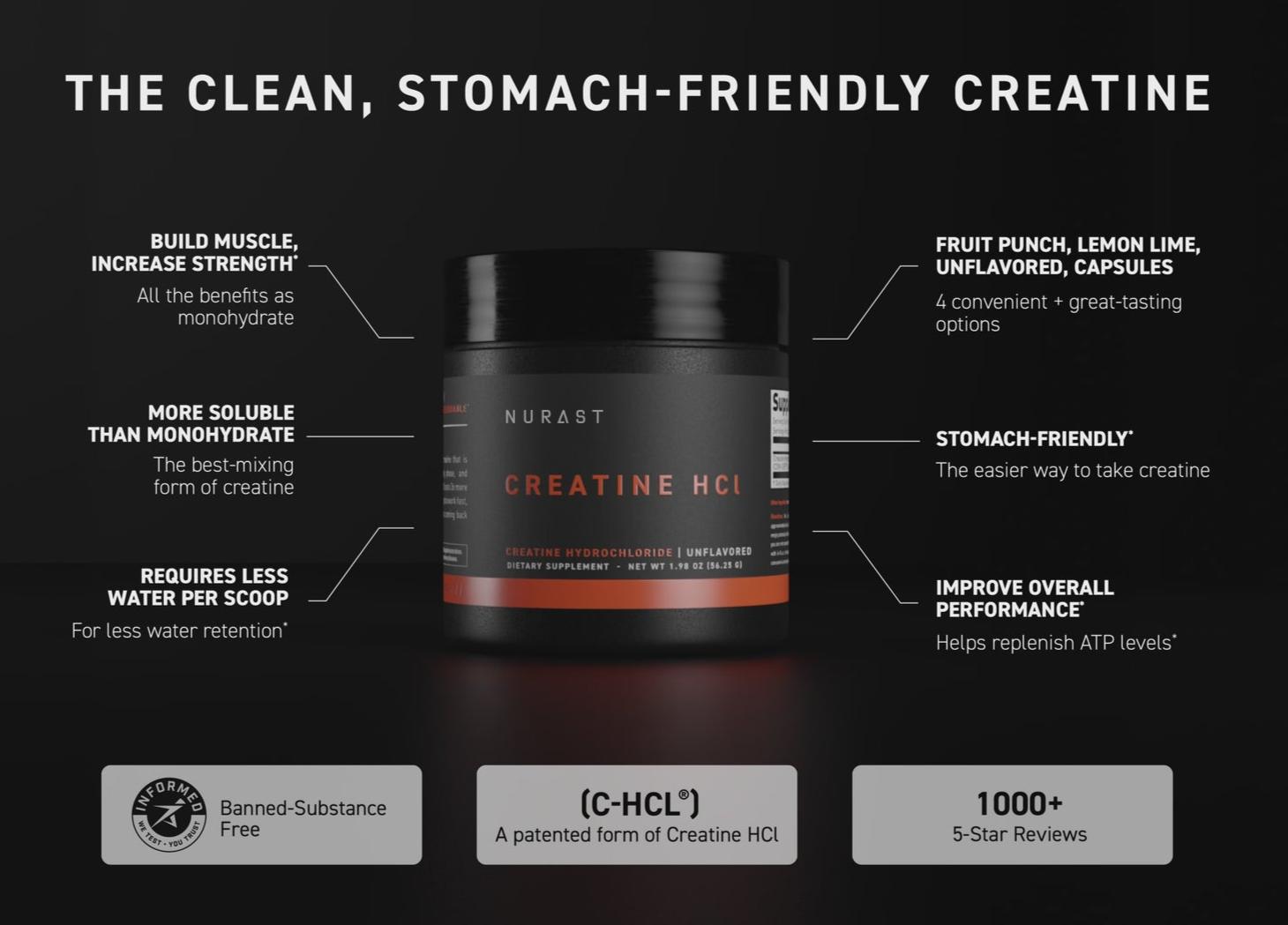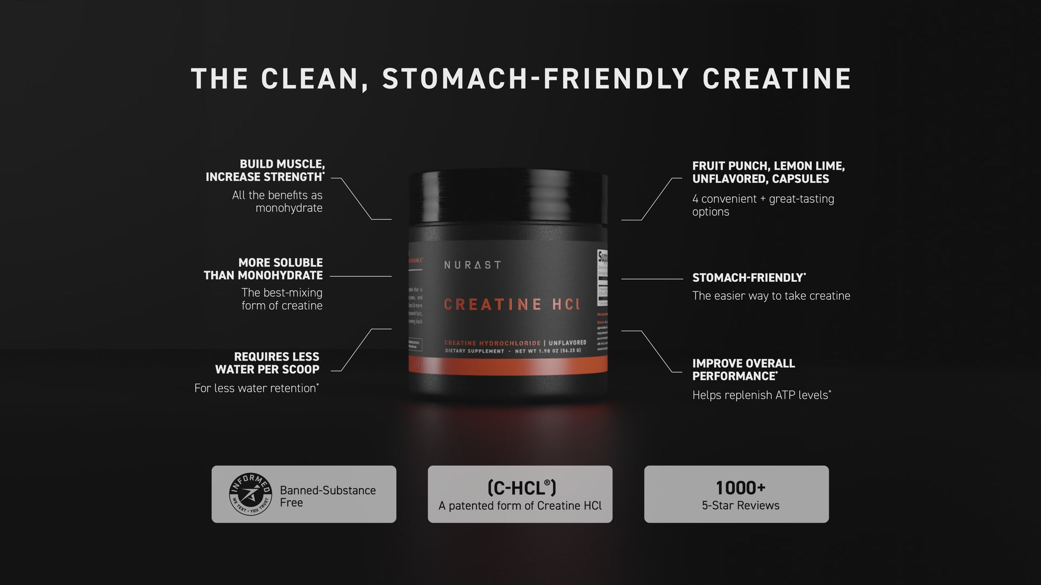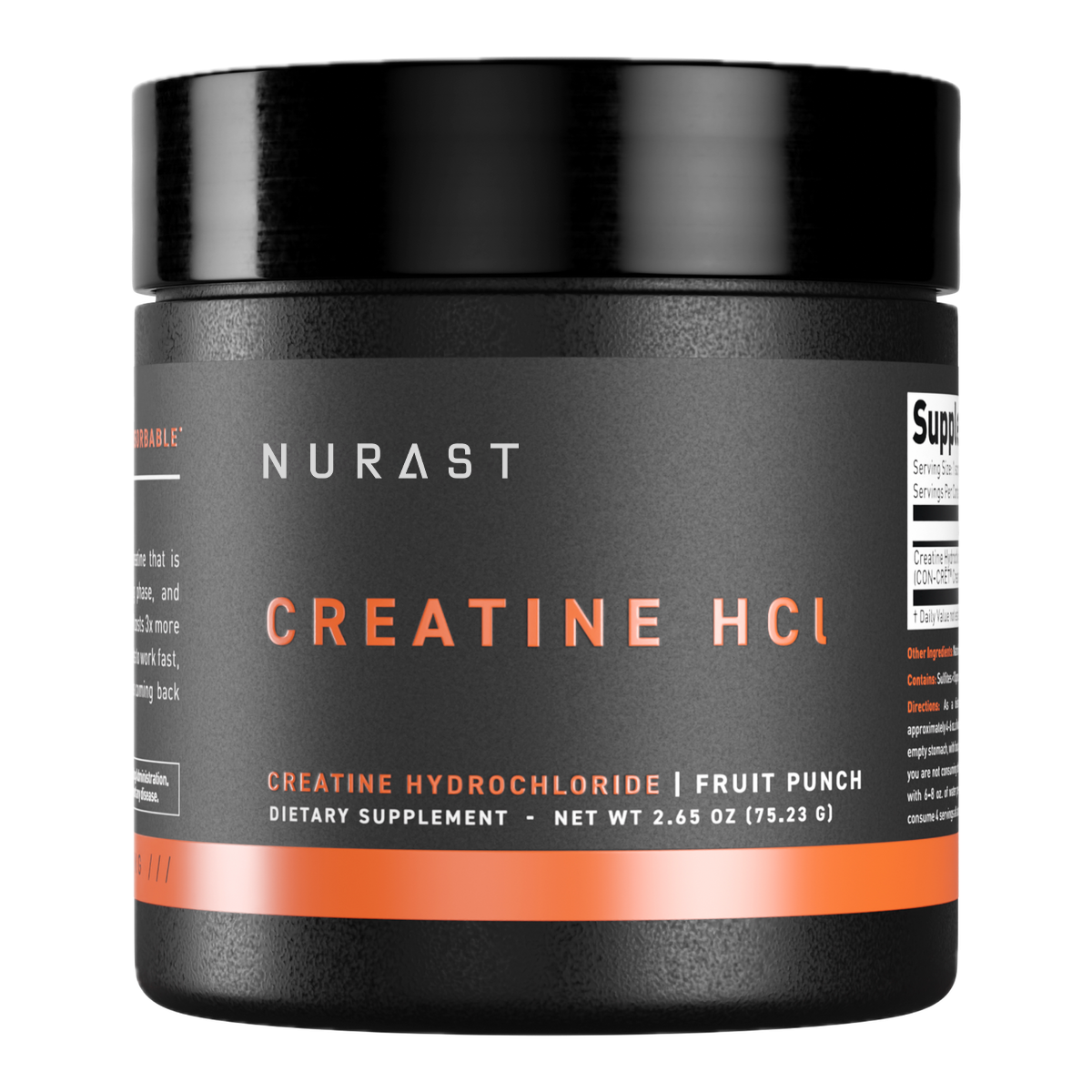 Nurast Creatine HCl® is a premium creatine supplement featuring an ultra-soluble, patented form of creatine hydrochloride. This means you can all the benefits of creatine, in a stomach-friendly, better-mixing form.* Backed by science and free of artificial flavors or colors, Nurast Creatine HCl® helps you lift more and build more muscle.