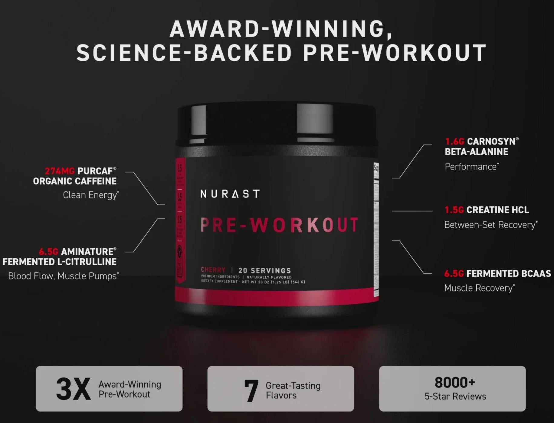 Pre-Nurast is designed for athletes who take their health and performance seriously This is a pre-workout optimized for weight training, HITT, and CrossFit. For cardio or sports, try Pre-Nurast Sport.
